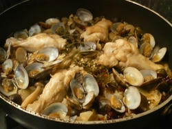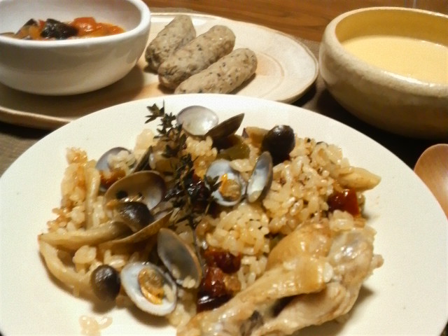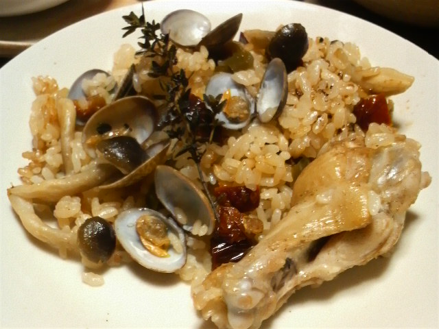 でも、鶏肉、あさり、イカ、ドライトマトからおいしいスープが出て、ふっくら炊きあがりました。