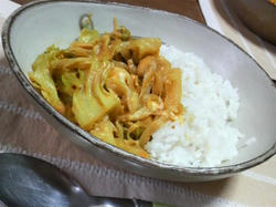 6月22日(昼) キャベツのサブジ 無印良品、「手作りカレーキット・インド風カレー野菜用」使用。
