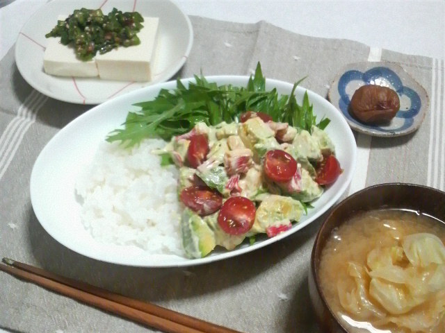 カニかまとアボカド、ミニトマトをマヨネーズとちょっぴりのおしょうゆであえてご飯に乗せました。