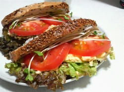7月5日(夜)たまご野菜サンド 関口パンで買ったセサミブレッドに、トマト、レタス、たまごフィリング、貝割れをはさんで。