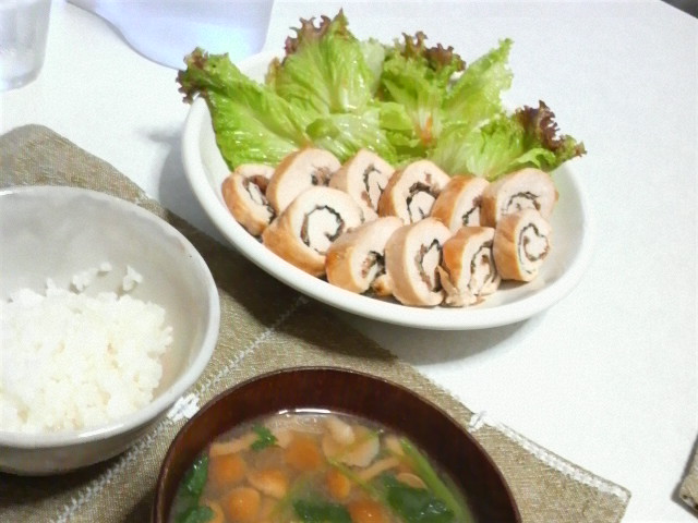 7月6日(夜)鶏ムネ肉の梅しそロール・なめこと三つ葉の味噌汁 鶏むね肉は観音開きにして、叩いて厚さをととのえます。
