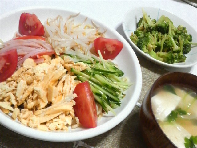 7月7日(夜)冷やし中華・ブロッコリーのゴマ和え・三つ葉と豆腐のお吸い物 今年初めての冷やし中華の具は、カニかま、もやし、きゅうり、たまご、トマト。