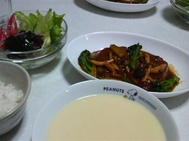煮込みハンバーグとサラダ、コーンポタージュ。